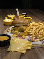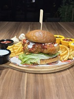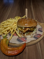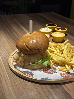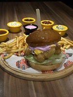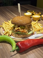 150 gr. ev yapımı çıtır tavuk göğüs, cheddar peyniri, yeşillik, acı sos, jalepeno turşu, mayonez