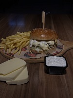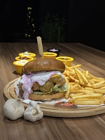 150 gr. ev yapımı çıtır tavuk göğüs, cheddar peynr, yeşillik, turşu, mor meze,mayonez, el yapımı sarımsak sosu