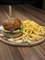 130 gr. ev yapımı dana burger köftesi, cheddar peyniri, yeşillik, karamelize soğan, mor soğan, turşu, OBurger sos.