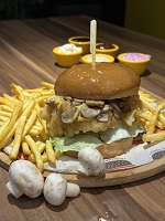 150 gr. ev yapımı çıtır tavuk göğüs, cheddar peyniri, yeşillik, mantar sote, turşu, mayonez